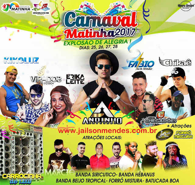 A Prefeitura de Matinha acaba de anunciar a programação oficial do Carnaval do município em 2017. O anúncio foi feito pelo secretário de Cultura e Turismo, Gerlan Alves e visa resgatar a festa popular naquela cidade.