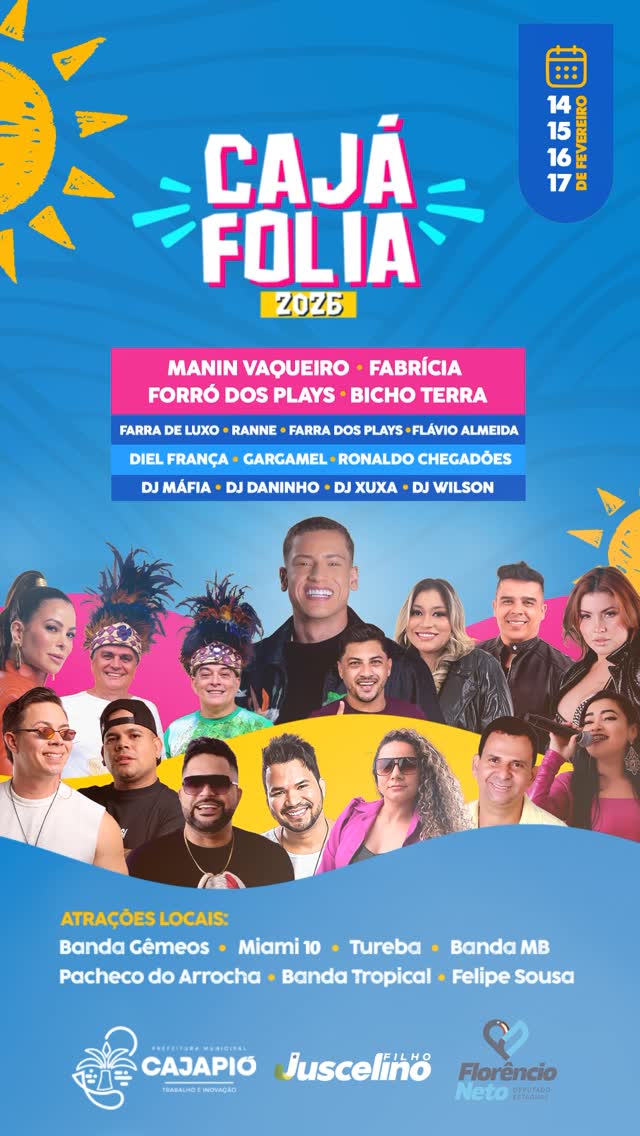 O prefeito de Cajapió, Dr. Rômulo, anunciou oficialmente a programação do Carnaval 2026, que será realizado entre os dias 14 e 17 de fevereiro. Com o tema “Cajá Folia 2026”, a gestão municipal promete quatro dias de muita música, animação e valorização da cultura local.